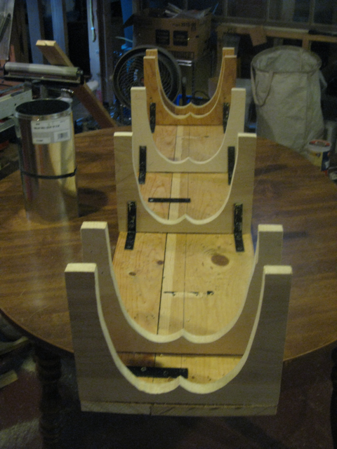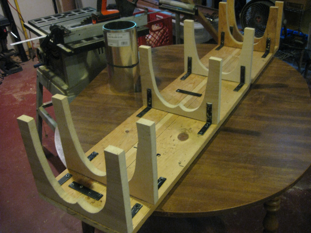 This was the second trough I tried to build, and so it incorporated the lessons learned the first time around. One big change was the material for the trough shape guides. I wanted something thick enough that I could screw the metal directly into it (the first version used laser-cut plastic guides, about 1/4" thick, which the metal was essential sewn to using old copper housewire. Not a recommended approach). This worked fairly well, although I used some scrap I had onhand, and it tended to split a bit. Better wood, smaller screws, or predrilling would probably take care of this.