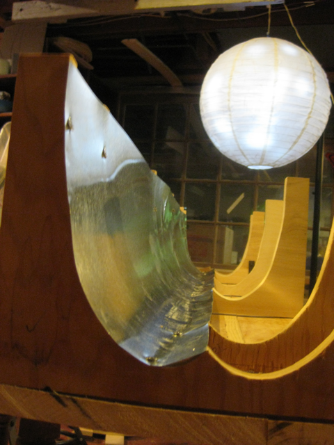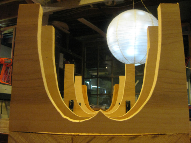 This walkthrough is incomplete for the time being. It wasn't until things were well underway that my wife suggested documenting the process, which was a great idea. In the first picture, I've already cut the 6 guides for the trough and mounted them onto some scrap lumber. I'll fill in the gaps regarding the creation of the shape later, but the quick way to handle this is to download and print this flyer. The reflector shape on the flyer is a 1 to 1 representation of the real thing, so if you cut it out and trace this onto a piece of wood, you'll be ready to start cutting.