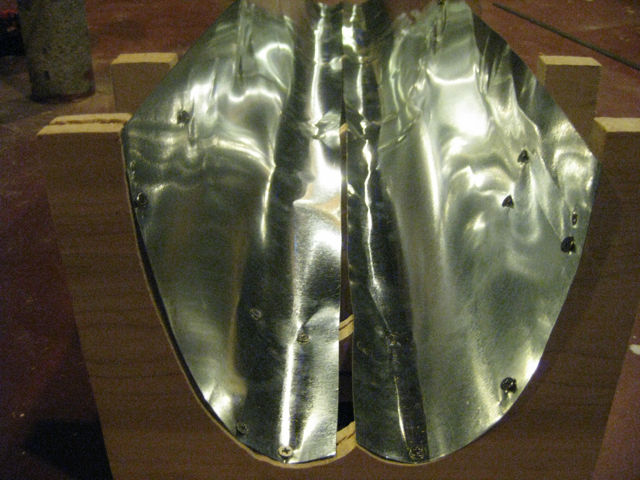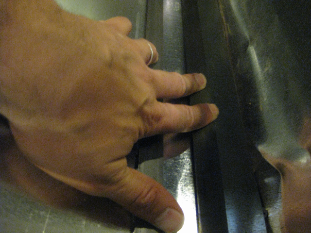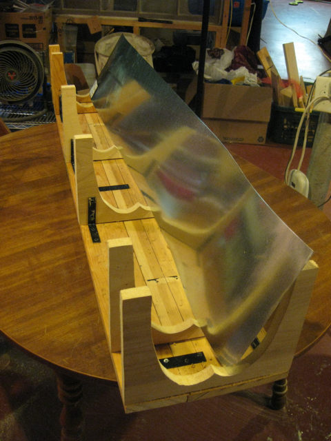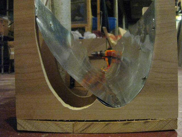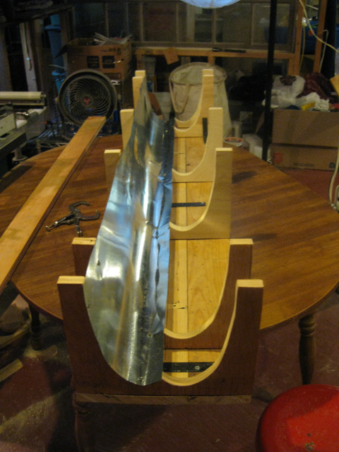Time to use the guides to create the shape. I used metal roof flashing for this, which by happy coincidence is exactly the correct width for one half of the trough. It is, however, devilishly hard to work with. It bows well up to a point, but then the metal creases. The tightest point of the curve at the bottom of the trough seems to be about the limit of what the metal can take before bending. I'd suggest some extra hands for this part, if you have access to them. Basically, the goal was to hold the metal into place long enough to put some wood-screws into it, pining it to the wooden supports and using the shape cut into the wood to hold the shape for the metal.