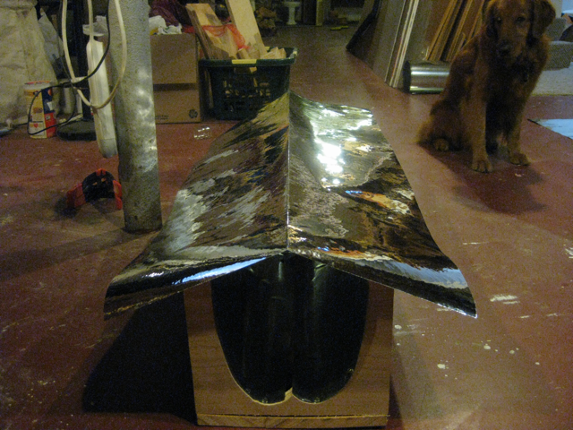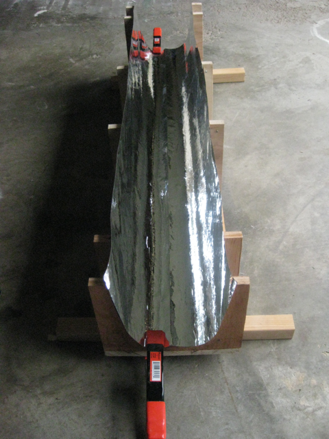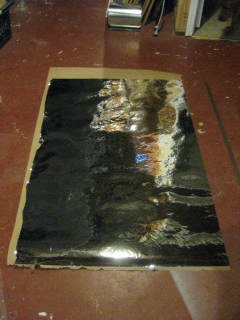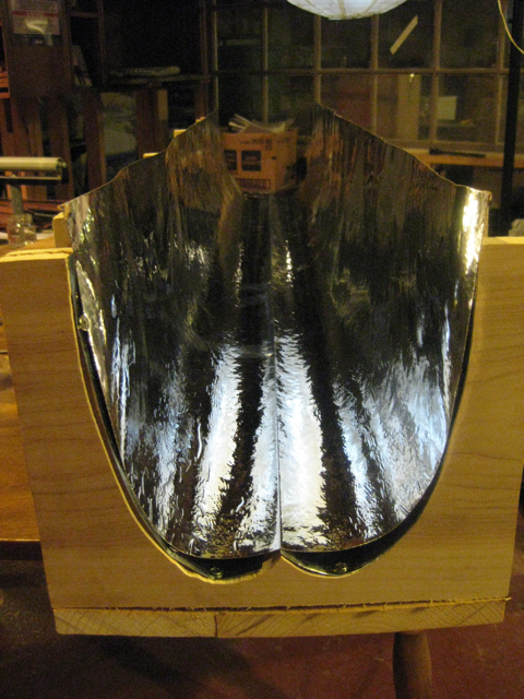 The other big change was adding the builder's paper backing to the mylar. On the first trough, I tried to adhere the mylar directly to the metal once it had been sewn into the trough. This was really, really hard to do -- mylar is hard enough to work with when you're dealing with simple planes, but almost impossible with curved surfaces. It's just too easy to get some part of it just a little off, causing big wrinkles to appear. Gluing it to the paper backing made it much easier to manipulate and get into the trough with many fewer wrinkles. This wasn't a complete success, though, as the paper was susceptible to moisture, and had a tendency to buckle and deform slightly over time.