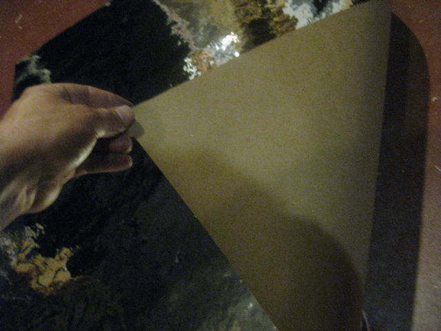 Gluing the paper backing to the metal flashing. I did this in two steps (one for each side), pulling the paper back, sprayed adhesive on the metal, and then carefully pressing the paper to the metal, working from the center of the trough out to the edge. Clamp, let dry, repeat for the other side.