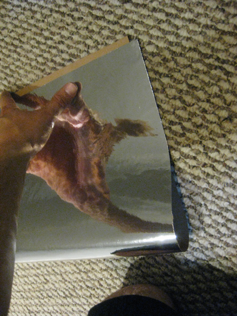 The second side is in, and looking a little bit better than the first. Unfortunately, the edge of the 2nd piece of flashing didn't quite make it to the point of the reflector, but given my approach of attaching the mylar, that's OK. If I were going to try to attach the mylar directly to the metal, this would have been a problem.